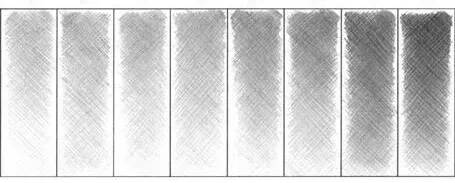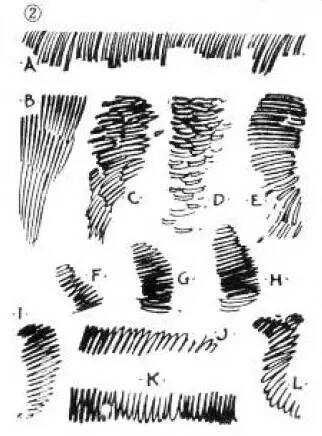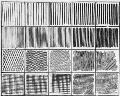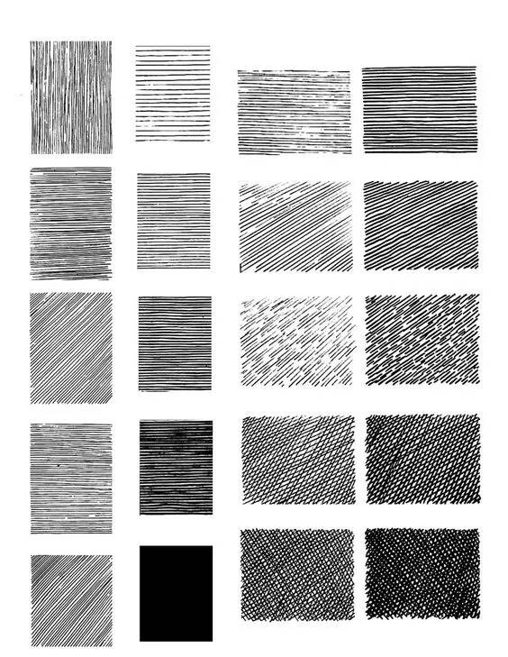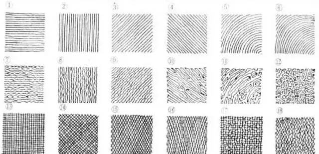 排线有两端轻,中间重的线条,也有一边轻一边重的线条,方向一致,疏密匀称,能变换排线方向,一层一层加深的。