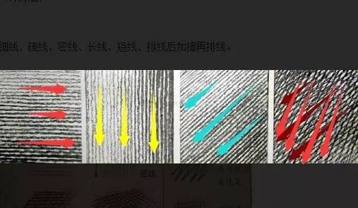 二、排线的方向,通常由右上方向左下方往返进行排列,也有自上而下,自左而右或垂线排列等,方法与人的生理相适应,这些排线的方法在素描中用得较多。