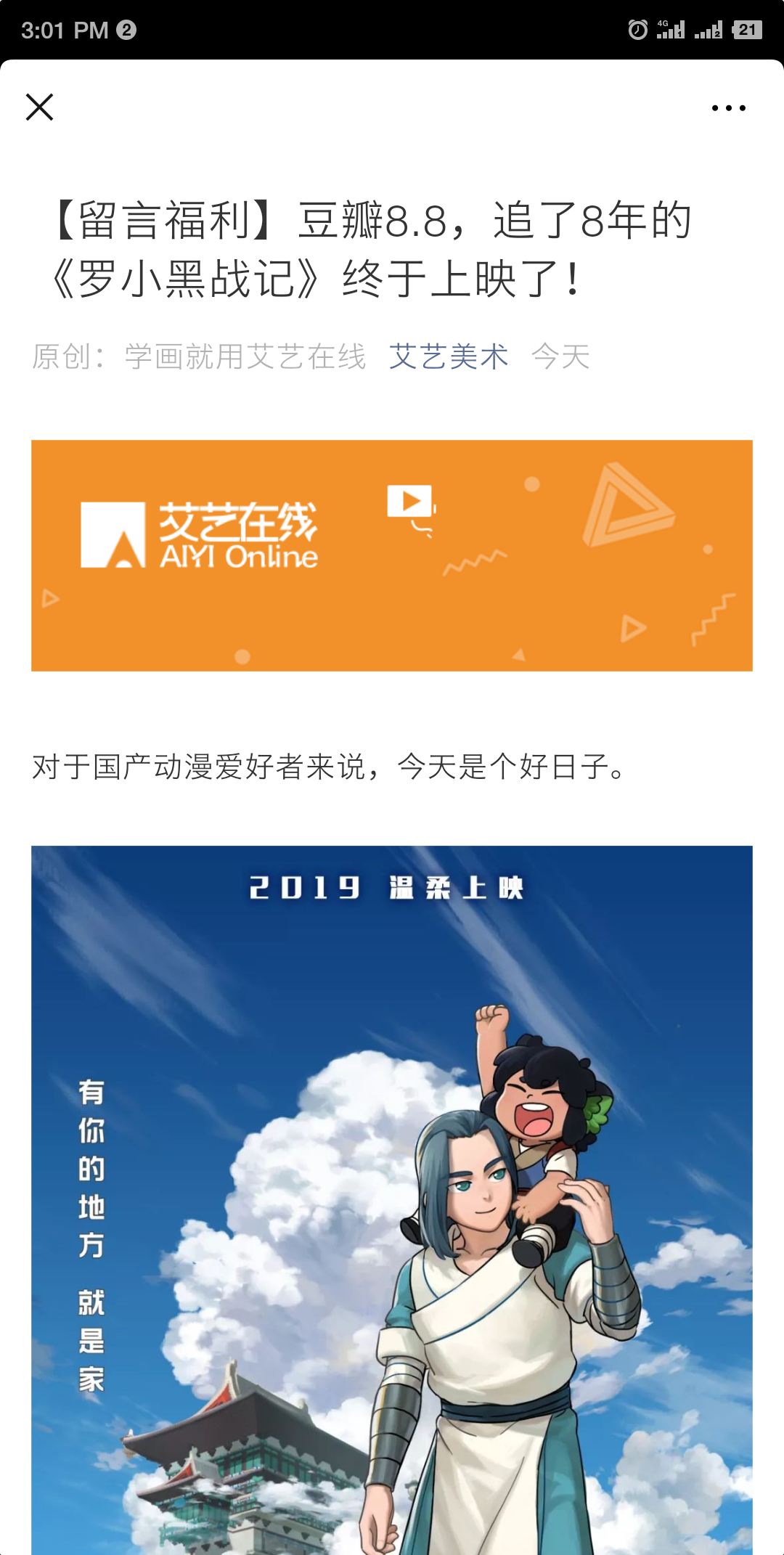 现在,主要关注艾艺美术公众号,首条推送中就有送《罗小黑战记》福利活动哦